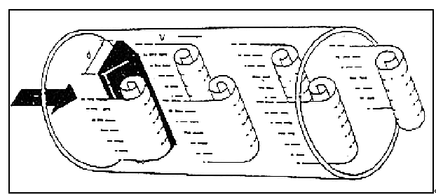 在流體中設置非流線型旋渦發生體(阻流體),則從旋渦發生體兩側交替地產生兩列有規則的旋渦,這種旋渦稱為卡門渦街,如圖(一)所示。